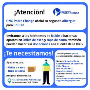 La ONG Padre Chango abrirá el segundo albergue para la ciudad de Chillán y necesitamos tu colaboración. Toda la información en la gráfica. Para mayor información puedes consultar los números en la sección «contacto» del sitio web ó los correos electrónicos de abajo.